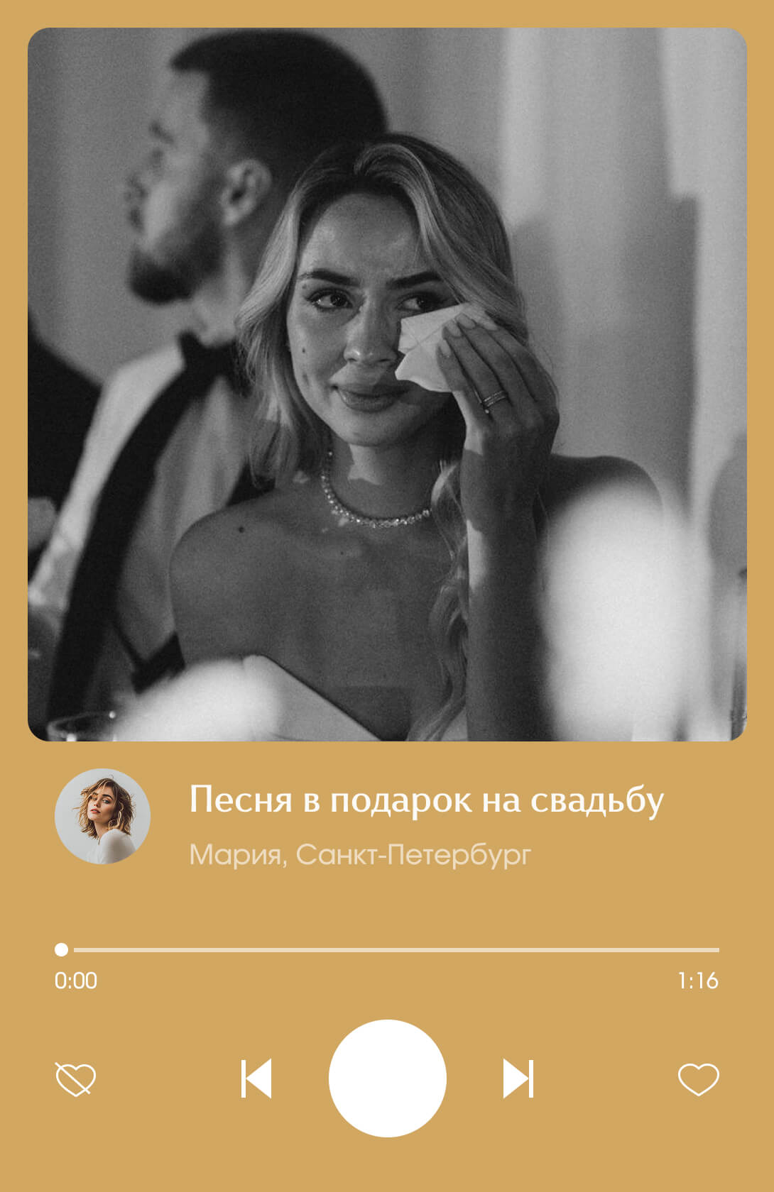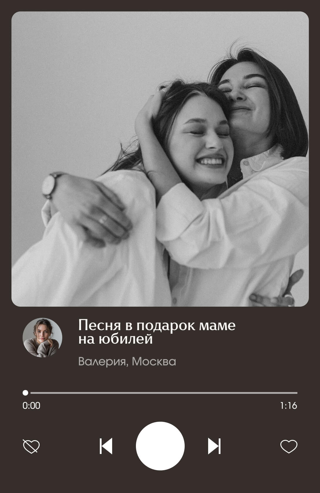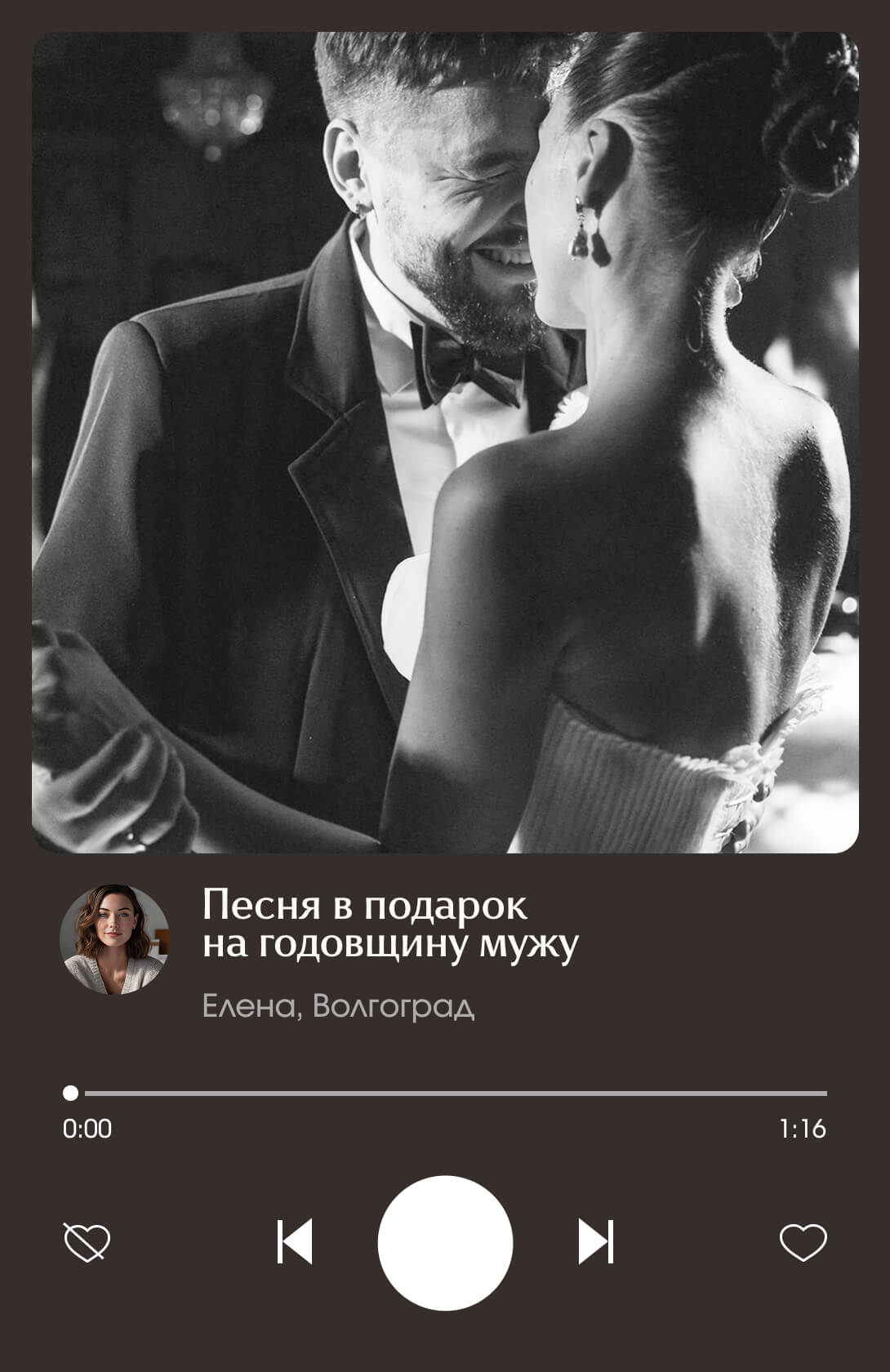 Заказала песню любимому человеку. Ребята очень внимательные, поэтому в тексте было много нюансов из моей истории, это очень здорово, получилось ну прям очень лично. А самое главное получилось передать именно то, что я хотела. Спасибо вам, вы помогли мне сказать то, на что не хватало слов…